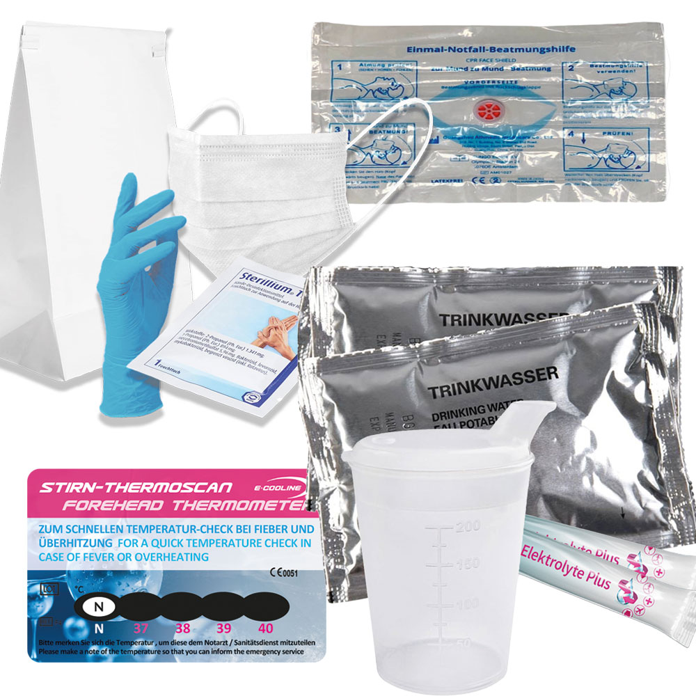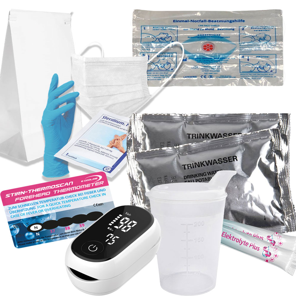 – Hygieneartikel für PSA (2 Paar Einmalhandschuhe [PSA Klasse III], 2x Spuckbeutel, 2x Desinfektionstücher, 2x Medizinische Gesichtsmaske [Medizinprodukt Klasse I])