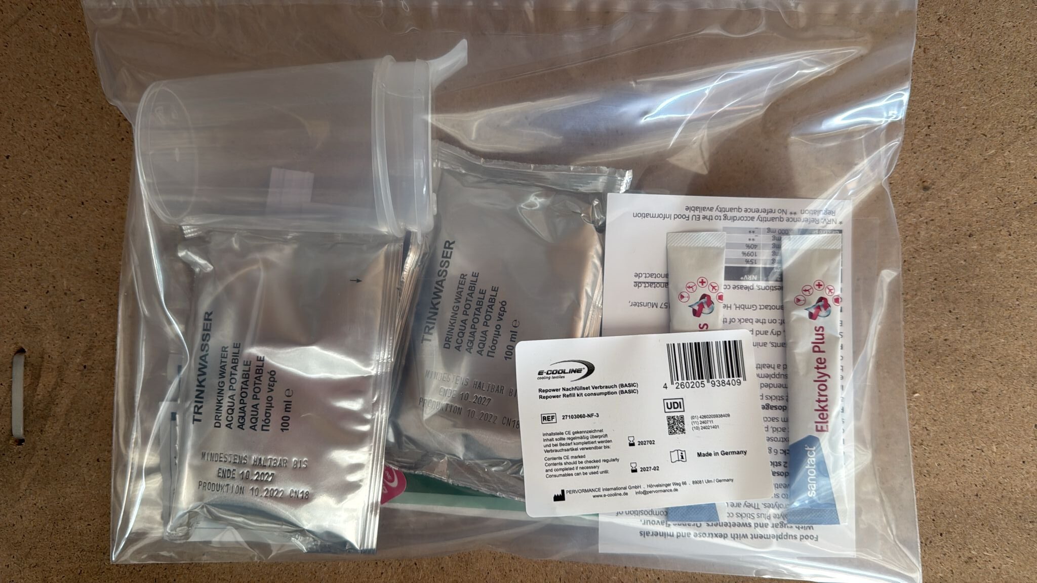 – Flüssigkeitszufuhr (2 Trinkwasserbeutel je 100ml, 1 auslaufsicherer Trinkbecher mit Trinkhilfe, 2 Beutel Elektrolyte PLUS Pulver)